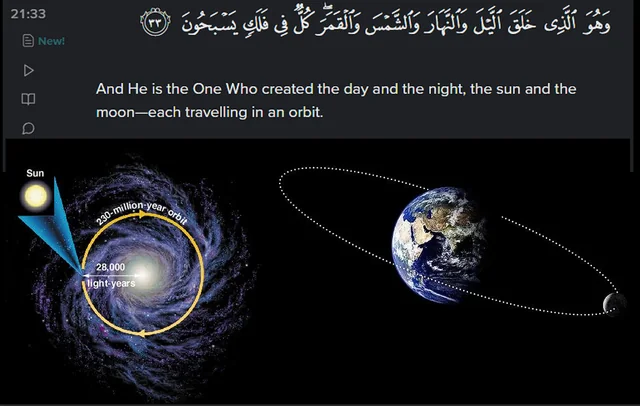 In Surah Al-Anbya, it states “And it is He who created the night and the day and the sun and the moon; all [heavenly bodies] in an orbit are swimming” (Quran, 21:33). Although it was only a widespread belief in the 20th century amongst the astronomers, today it is a well-established fact that the Sun, the Moon, and all the other bodies in the Universe are moving in an orbit and constantly moving, not stationary [reference] as commonly thought before.